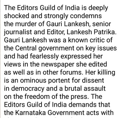 Condemn killing of senior journalist Gauri Lankesh. Hope speedy investigation is conducted & justice delivered. Condolences to the family.