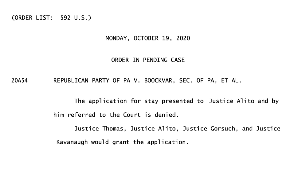 SCOTUS upholds Pennsylvania court ruling to allow the state to receive and count mail-in ballots three days after the election